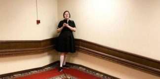 Перед вами знімок, зроблений у Держдумі Російської Федерації, вимагає до себе підвищеної уваги, щоб зрозуміти, що на ньому зображено. Виявляється, що жінка стоїть на пандусі, який йде поруч зі сходами і теж покритий килимовою доріжкою, однак в повній мірі це можна зрозуміти, поглянувши на друге фото.