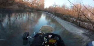 Веселі покатушки на картингу по замерзлому руслу річки швидко закінчилися. Пощастило, що все сталося на мілководді. 0 Йшов би швидше-проскочив би тонкий ділянку!